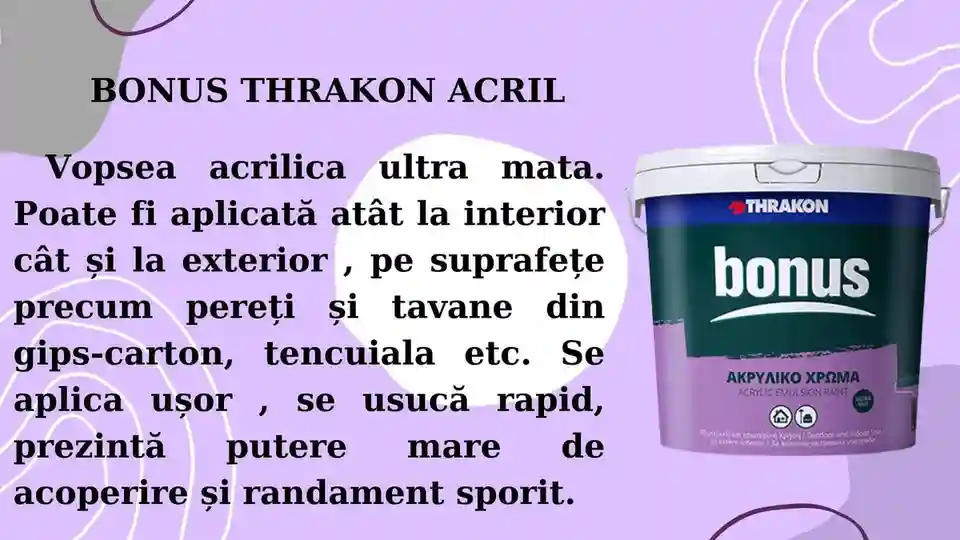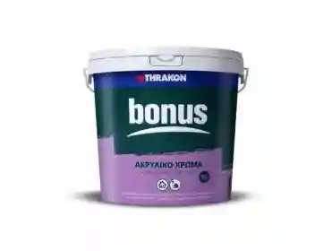 BONUS ACRYLIC is an acrylic emulsion paint for interior and exterior use.Specially designed for professional use it is suitable for areas requiring frequent painting and freshening up, such as public buildings, schools, hospitals, hotels, stairwells, storage rooms, ceilings, and surfaces soiled with graffiti, etc. It is odourless and absolutely user and environment-friendly. It is easy to apply, has exceptional coating qualities, resistant to adverse weather and high performance.